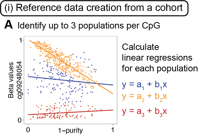 Creation of reference data from a cohort: in the reference_regressions_generator() function, reference linear regressions are calculated based on DNA methylation beta values and tumor purity estimates of a cohort. Each regression represents a sample population as shown in the figure below.