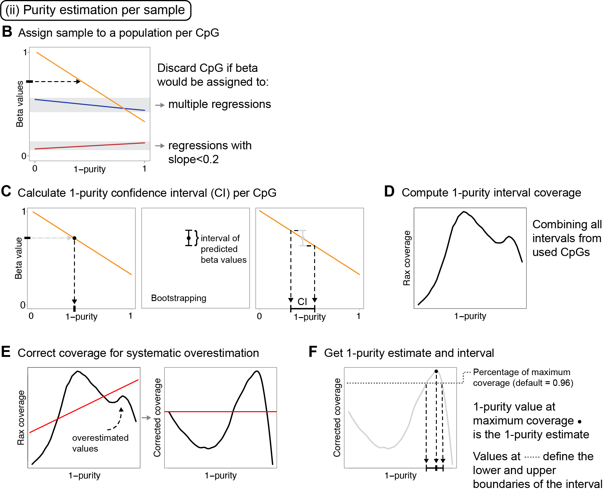 - Estimation of tumor purities for individual samples: in the purity_estimation() function, CpGs are first filtered based on beta variance removing those considered to be non-informatoive. Each CpG is then processed individually obtaining a sample purity interval. Finally, all the obtained intervals per sample are integrated generating a purity estimate for the sample.