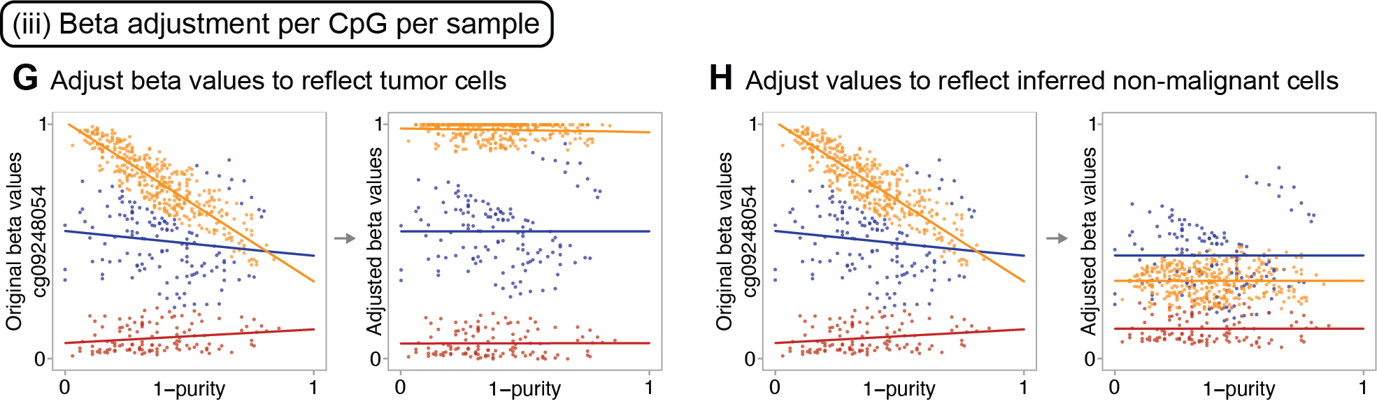 Method for calculating tumor purity and adjusting Illumina 450/850K DNA methylation beta values. This work has been described in the article “Tumor purity estimated from bulk DNA methylation can be used for adjusting beta values of individual samples to better reflect tumor biology” published by Sasiain, Nacer et al. in NAR: Genomics and Bioinformatics.